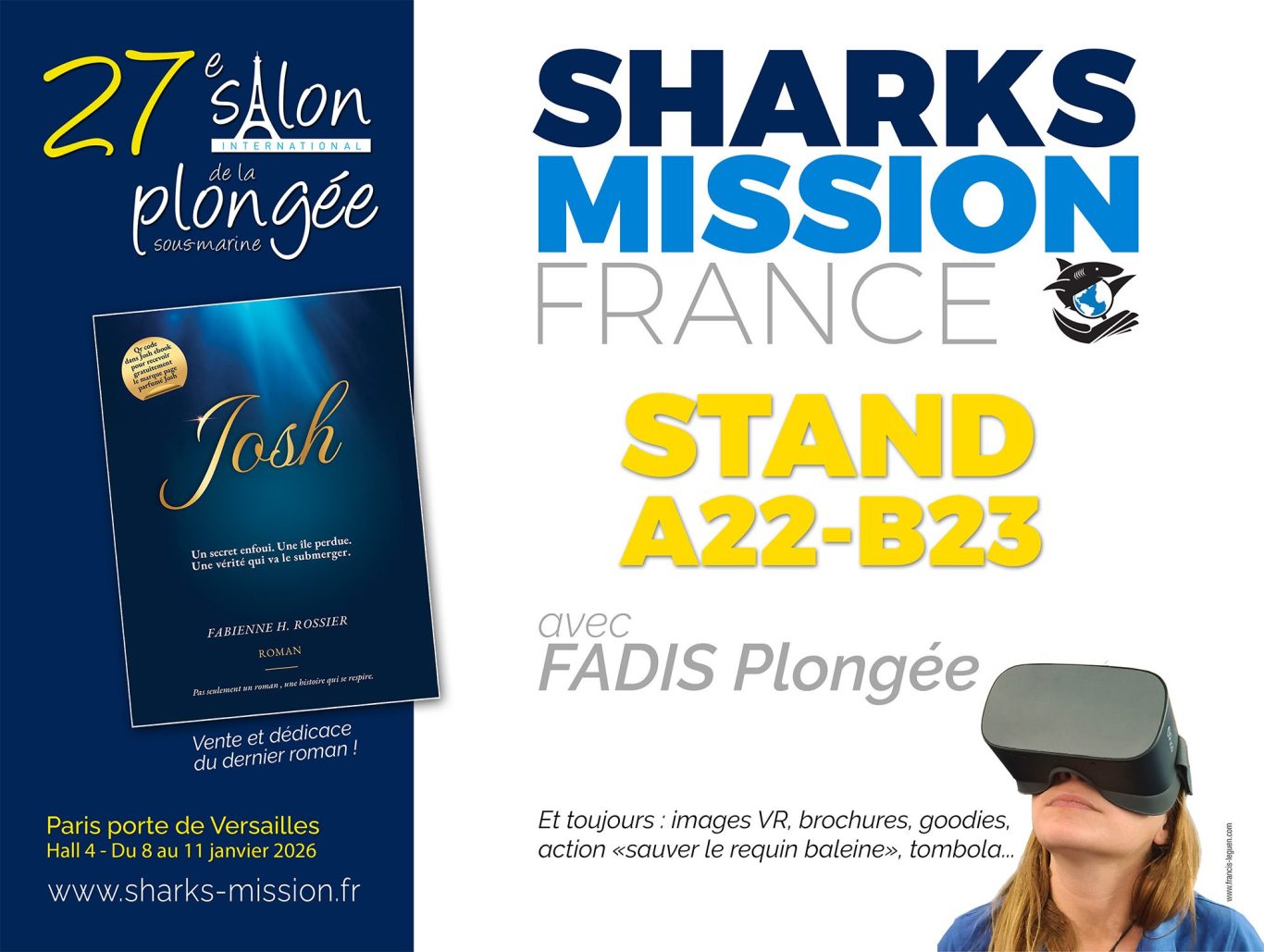 Venez rencontrer l'auteure de Josh et fondatrice de Sharks Mission France, association loi 1901 et son équipe de bénévoles du 8 au 11 Janvier 2026 à Paris.